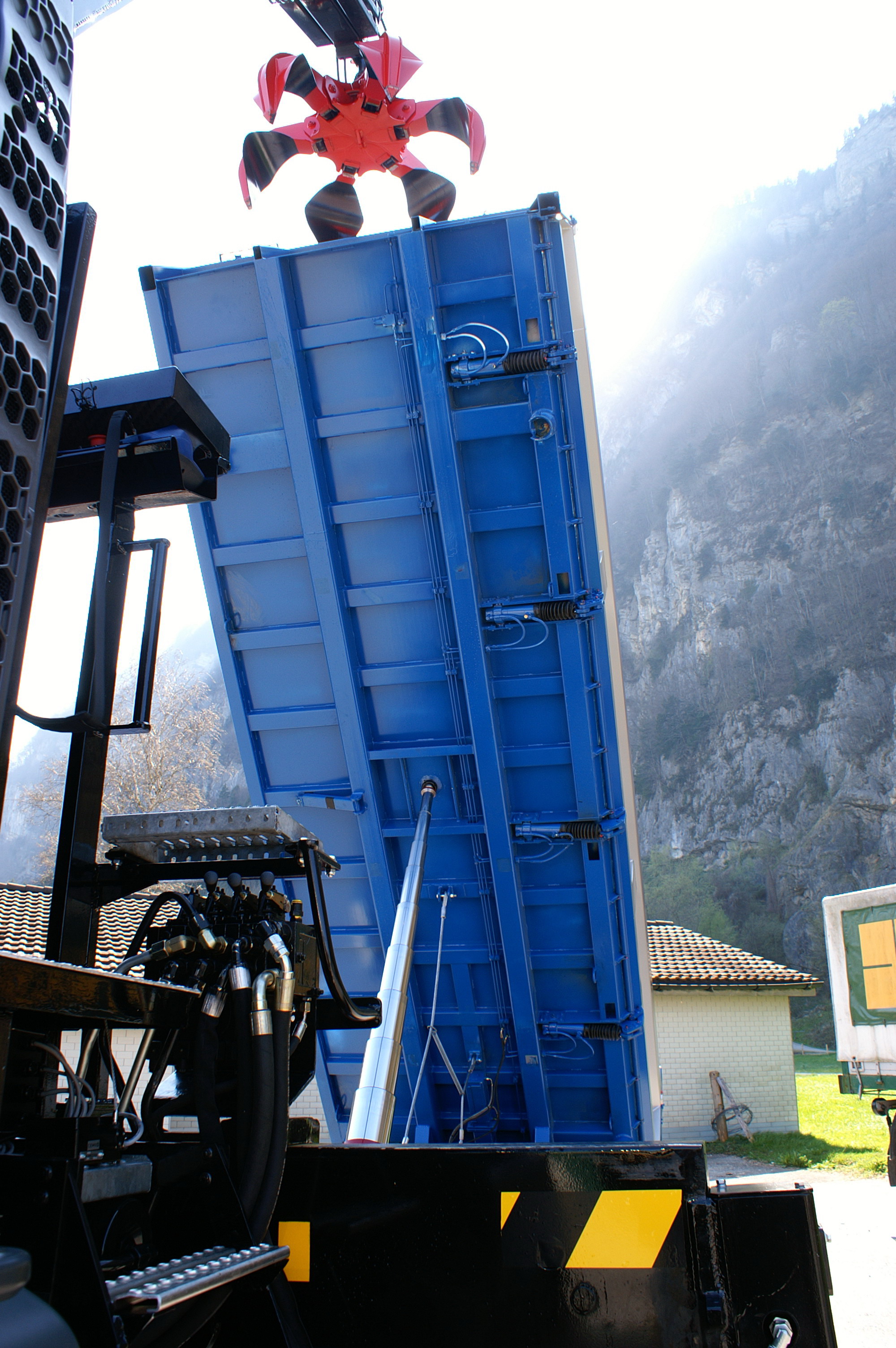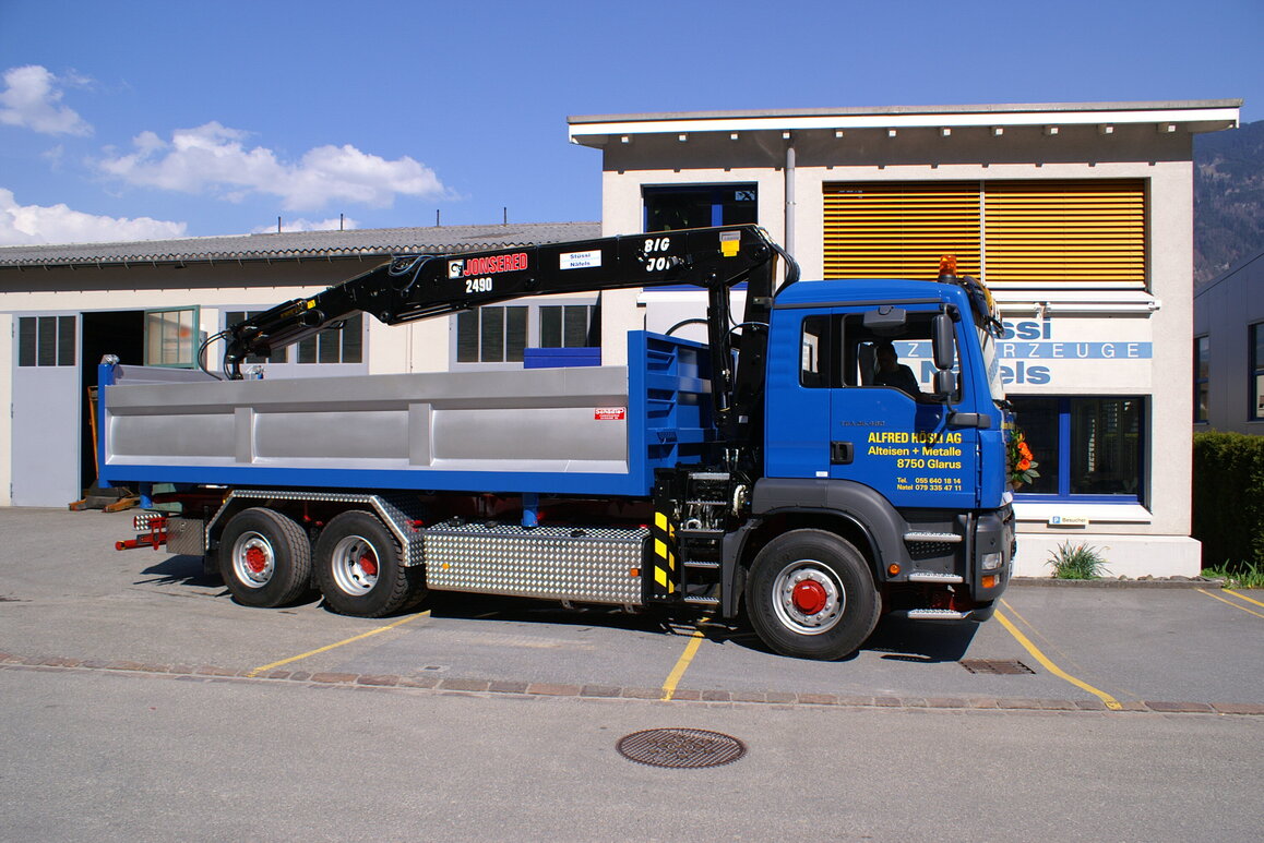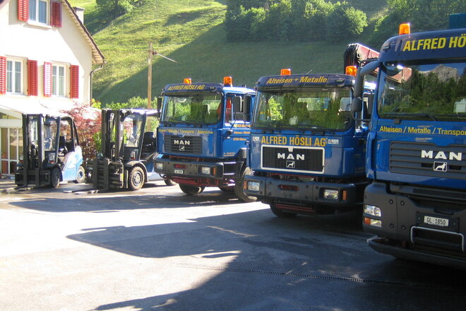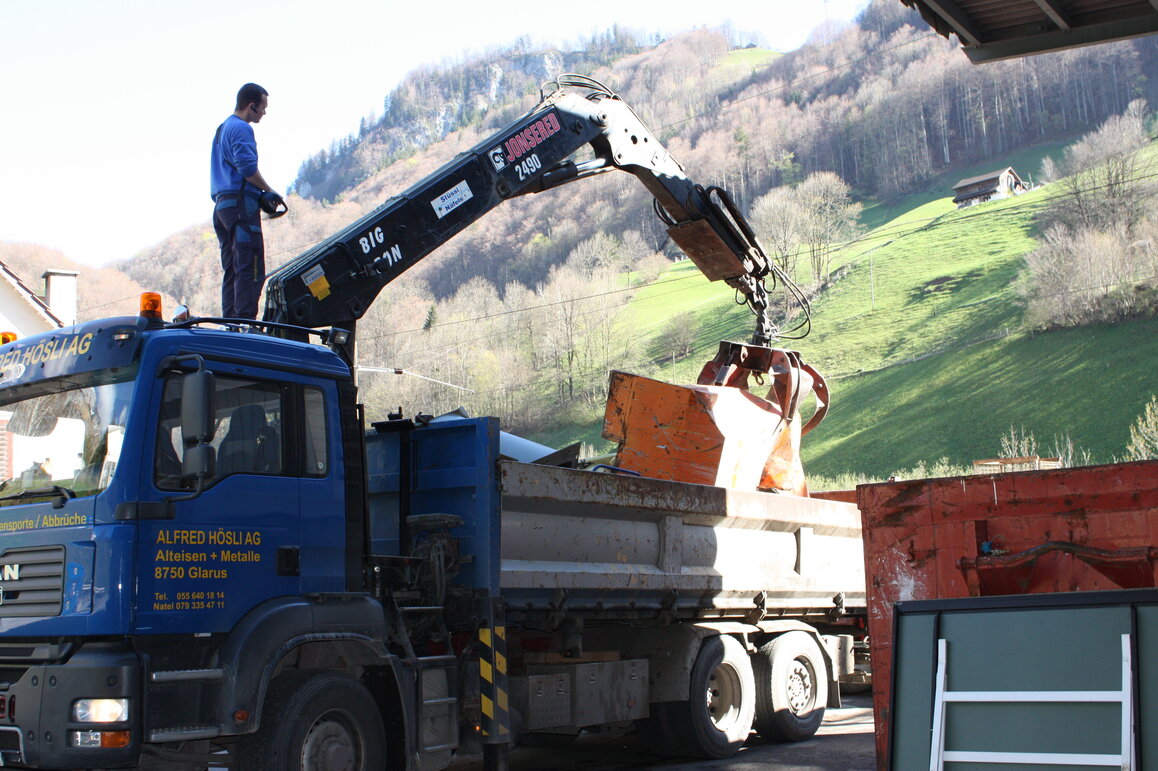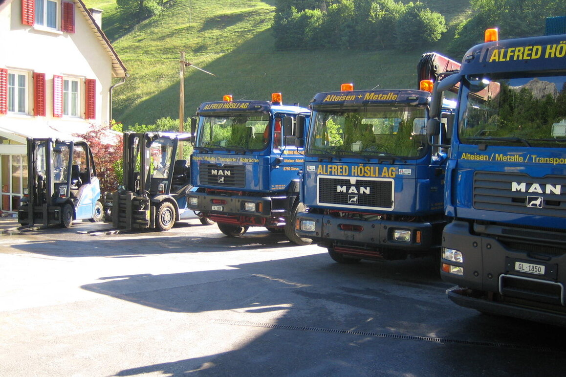 Kleintransporter bis 3.5 Tonnen, LKW-Hakengeräte mit Absetzmulden und LKW mit Kran bringen von privaten und industriellen Kunden aus dem ganzen Umkreis Schrott und Reststoffe auf unsere zwei Firmengelände in Glarus und Weesen.